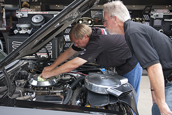 (8 & 9) John with LIA Magazine stopped by Speed by Spectre to check out the fitting of the nice dual snorkle air breather that he wants to swap out for his old one on his '66 Impala wagon. Mike with Speed by Spectre is checking out the clearance with the hood. Did John get the air breather?? Check the car out the next time you see it...