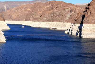 (51) The white mineral stain you see in the image is showing the obvious that Lake Mead's water level is shrinking. All of this is caused by the many years of drought out here in the western states. The upside is this problem reveals the ghost town, St. Thomas, that was submerged by the government after purchasing the land to build Hoover Dam. Another popular site is for divers, which is the wreckage of the B-29 that crashed in 1948 that went down in 240 feet of water. The depth is now about 102 feet. This increases the tourism.