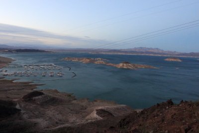 (61)Because of the drought many marinas have either closed or moved the docks further out into Lake Mead. You can see the receding of Lake Mead by the mineral stain on the one ridge above the water. Most of it is white with just the cap brown.